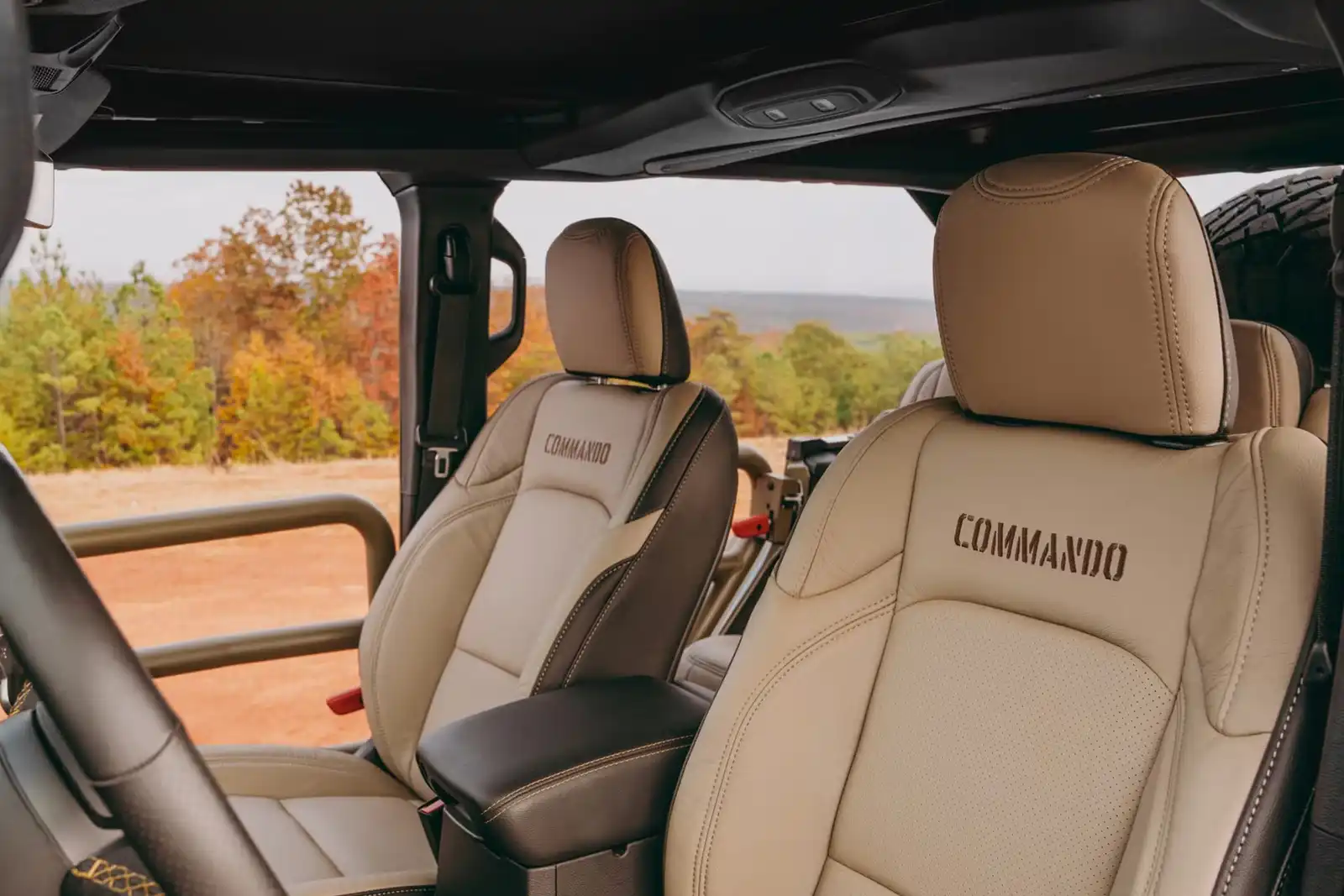 Innen trifft Tradition auf Moderne: Ledersitze in hellbraunem Ton, edle Nähte, moderne Instrumentierung, der Jeep Wrangler Commando verbindet Abenteuerlust mit Alltagstauglichkeit.